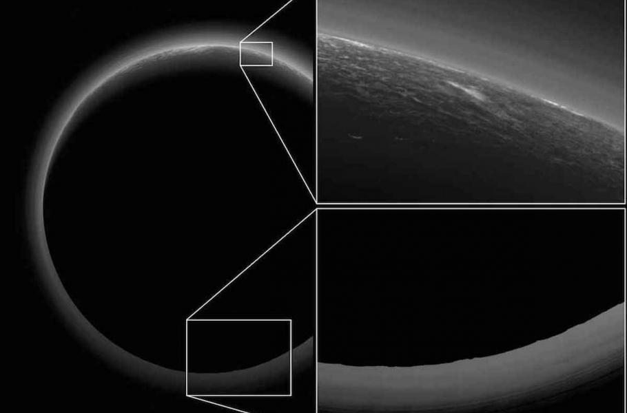 Přibližně 19 minut poté, co sonda New Horizons minula Pluto, pořídila její kamera Ralph tento neobyčejný snímek. Obraz noční strany Pluta ukazuje jeho řídkou a překvapivě komplexní atmosféru s vrstevnatými závoji. Srpek osvětlené krajiny nahoře zachycuje plochou pláň, neformálně pojmenovanou Sputnik Planum, ve spodní části se pak nachází divoká krajina Norgay Montes. Atmosférické modely naznačují, že v atmosféře Pluta může za určitých okolností docházet tvorbě mraků.
