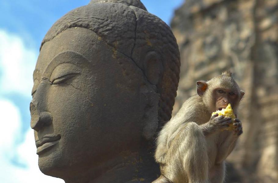 Lopburi, ležící zhruba 150 kilometrů severovýchodně od Bangkoku, má zvláštní populační složení: spolu s 27 tisíci lidí tu žije dva tisíce makaků. Opice ve městě zabydlely lampy veřejného osvětlení, římsy domů, televizní antény na nich, o kus dál střechu nádraží a občas, na malou chvilku, než se lidský majitel vzpamatuje, i nějaký ten voňavý stánek v městské tržnici. Ale především si oblíbili dva chrámové komplexy Sarn Phra Karn a Prang Sam Yot, kde se k jídlu dostanou úplně bezpracně – lidé jim ho tam sami nosí až pod nos.