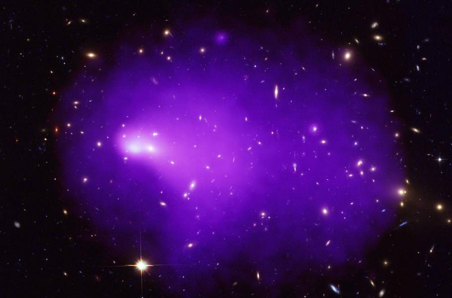 Obrovský systém Abell 2146 vznikl srážkou dvou kup galaxií. Modrofialově je znázorněno rentgenové záření horkého plynu. (foto: NASA/CXC/University of Nottingham/H. Russell, CC BY 4.0)