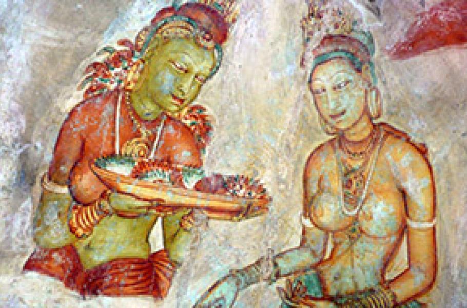 Vcházíme do vodních zahrad, v září jsou ovšem bez jediné kapky vody. „Pozor, nešlapejte na trávník!“ hlásí nápisy každých padesát metrů. Žádný trávník tady ale není, nepršelo několik měsíců. Skála Sigirie, jež je vidět na několik kilometrů, je obklopena malými jeskyněmi. Po točitých schodech se dostáváme k jeskyni se zdmi pomalovanými kráskami. „Každá z nich představuje jinou národnost. Tato je Kambodžanka, tato Mongolka,“ vysvětluje Sinhálec, jenž nás při našem výstupu dohnal. „A podívejte, tato má tři bradavky a tato tři ruce,“ směje se pochybení autora z pátého století. Tehdy tam bylo kolem pěti set namalovaných krásek, dnes je odhaleno méně než padesát z nich.