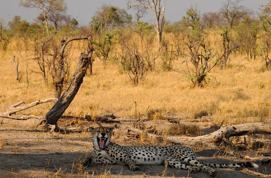 Sledujeme gepardy ještě pár desítek minut. Je už tma a oblohu co chvíli protne oslnivý blesk. Zatím neprší, ale delta Okavanga burácí v toužebném očekávání nebeského přívalu. Období dešťů má několik měsíců čas. Ve tmě se mi promítají výjevy z dnešního odpoledne: stébla trávy, dlouhá jízda a nakonec překvapivé rozuzlení. A jako tečka věta: „Oni jsou tady doma.“ To přece platí i o našich průvodcích. Dívám se Joachymovi do očí a pronáším slova uznalých díků. Ještě budeme mít hodně času a já třeba zjistím, jak rozeznají vůbec nějaké stopy v místech, kde my vidíme jen trávu.