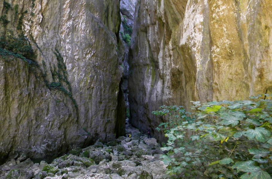 Po pravdě řečeno jsem při plánování cesty v případě kaňonu Celano nečekal žádný zázrak a nebyl jsem připraven na tuto otevřenou ránu v krajině. Skutečnost překonala všechna očekávání. Zpočátku nevidíte nic zvláštního. Jen pár nevysokých vápencových stěn a pěšinu, která po dni skalnatého údolí kličkuje mezi bujnou vegetací. Pak to ale přijde. Cestička se nejprve doslova „nacpe“ do kamenného hrdla soutěsky, překoná několik kamenných sesuvů a pak se dostává do samotného srdce kaňonu. Díky kolmým skálám vysokým přes sto metrů a vzdálených od sebe v nejužším místě sotva tři metry se jedná o nečekaně působivé místo.