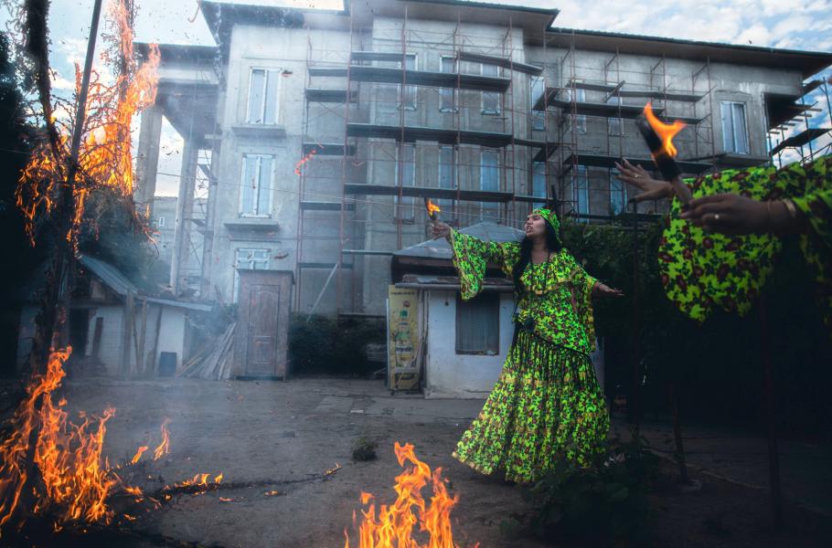 Cassandra (vlevo) a Anna začínají rituál zapálením ohýnku. Později na dvoře vzplane pořádná vatra. (foto: David Těšínský - se souhlasem k publikování)