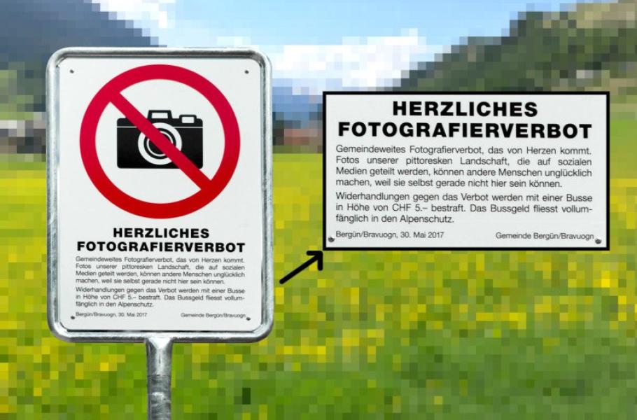 Pokud se chystáte na dovolenou do Švýcarska, foťák zaději nechejte doma. Platí to alespoň pro návštěvu malé horské vísky Bravuogn nedaleko Svatého Mořice. Zdejší radní nedávno přijali nařízení, které pořizování fotografií zapovídá pod hrozbou pokuty ve výši 5 euro.
