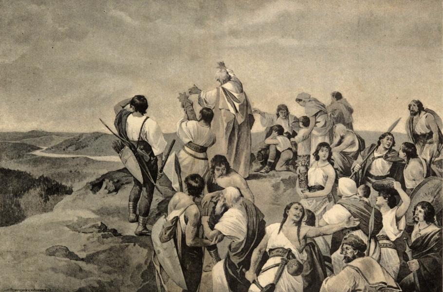 Příchod Čechů - původní reprodukce obrazu Věnceslava Černého. (zdroj: Národní knihovna České republiky, PDM 1.0)