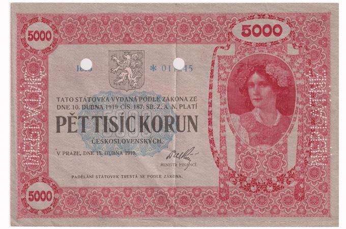 Pětitisícová bankovka z roku 1919 míří do dražby: Vyvolávací cena je rovný milion