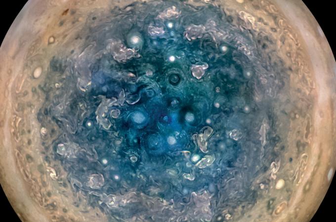Juno pořídila nové snímky Jupiteru: Odhalují obří cyklóny nad jižním pólem