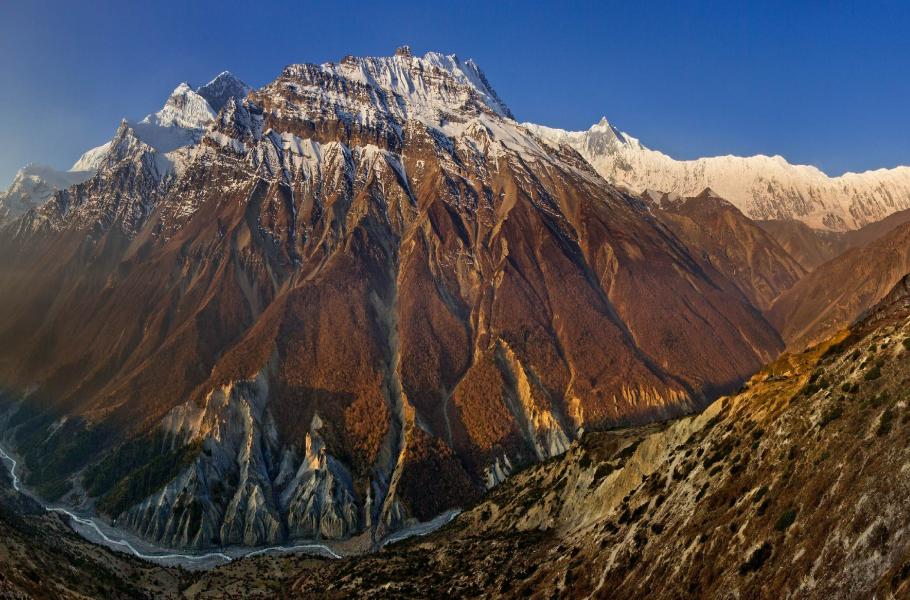 Těsně po poledni přicházíme ke Shree Kharka – místu, kde dnes budeme aklimatizovat a přespíme. Úžasný plac na focení nacházím asi 250 výškových metrů nad táborem. Slunce se sklonilo nad obzor a momentálně ho mám v protisvětle, což znamená, že ráno o půl páté by se opět mohla konat velkolepá podívaná. Přede mnou jsou bázeň vzbuzující obři Grande Barriere a Roc Noir a současně vidím, jak je panenský sníh na vrcholcích Annapurny III a Ganggapurny rozfoukáván silným větrem.