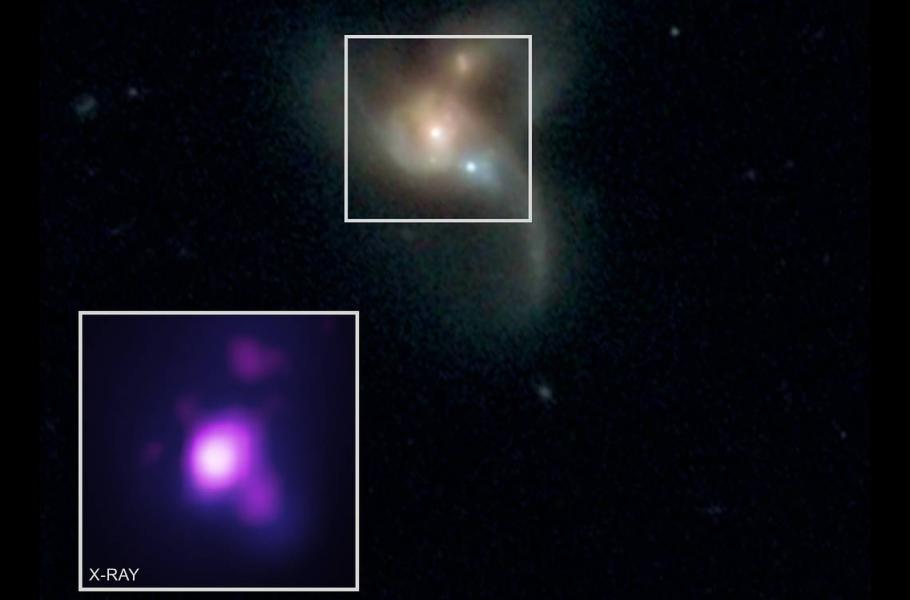 Během srážek galaxií může dojít i ke plynutí jejich supermasivních černých děr. Takových událostí pozorujeme celou řadu, dokonce v různých fázích vývoje. Velmi vzácně se ale stává, že galaxií tímto způsobem splývá více zároveň. Objevení takového jevu je vždy důvodem k oslavě.