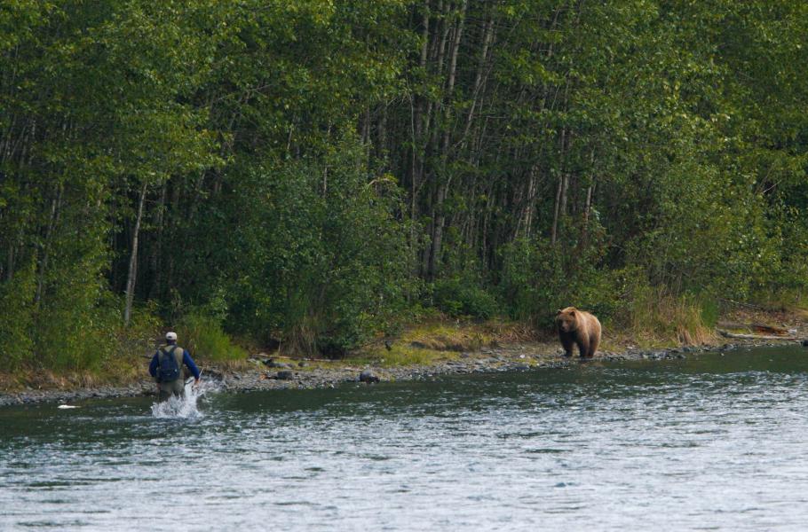 Od šelem je samozřejmě důležité udržovat bezpečný odstup a například u medvědů na Aljašce se uvádí vzdálenost zhruba tří set metrů. Když se přece jen dostanete blíž, může nastat několik různých situací. Jestliže vás medvěd nesleduje, je dobré pomalu vycouvat. V žádném případě se neotáčejte a neutíkejte. I když grizzly vypadá nemotorně, dokáže vyvinout rychlost přes 50 kilometrů v hodině, které člověk nemůže konkurovat. A především je útěk pro šelmu instinktivě výzvou vydat se do běhu za možnou kořistí. V případě, že medvěd přeci jen pokračuje směrem k vám, snažte se, abyste mu nestáli v cestě. Byl jsem sice svědkem situace, kdy rybáři začali na blížícího se grizzlyho křičet, ale nejde vždy o zaručený návod. Jeden den medvěd utekl, druhý den se ve stejné situaci klidil z cesty rybář. Huňáč totiž na křik napřed vůbec nereagoval a teprve po chvíli zaujal útočné postavení s pokrčenou hlavou. Naštěstí ale rybáři jen takto pohrozil a nic víc se nestalo.
