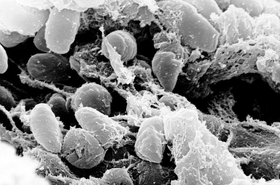 Bakterie Yersinia pestis pod skenovacím elektronovým mikroskopem. (foto: Wikimedia Commons, Rocky Mountain Laboratories, PDM 1.0)