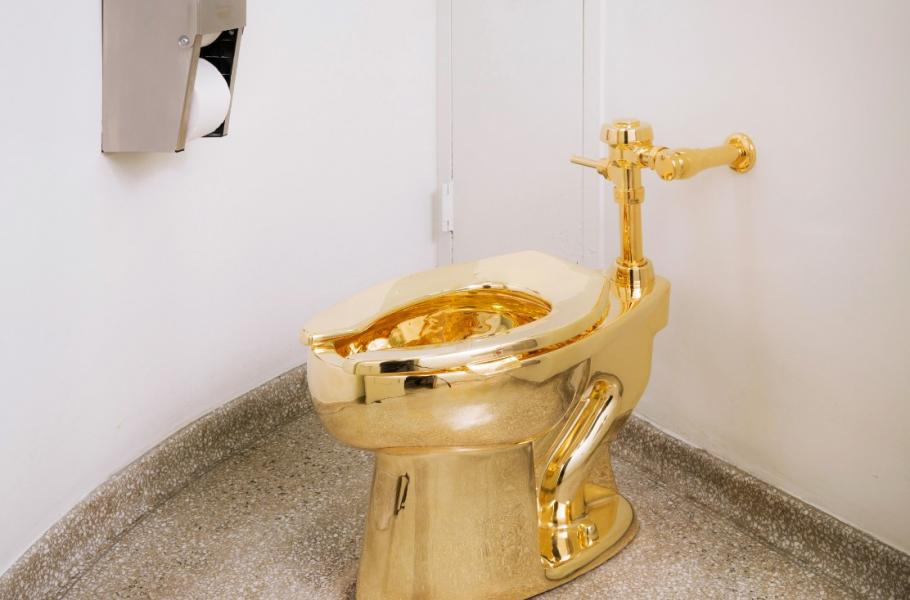 Poněkud výstřední umělecká instalace ozdobila v minulém týdnu Guggenheimovo muzeum v New Yorku. Toaleta z 18karátového zlata je dílem známého uměleckého vtipálka Maurizia Cattelana. Šestapadesátiletý Cattelan, který pochází z Itálie, proslul svými satirickými a více či méně vtipnými plastikami. Jednou z jeho nejznámějších je například socha papeže Jana Pavla II usmrceného meteoritem.