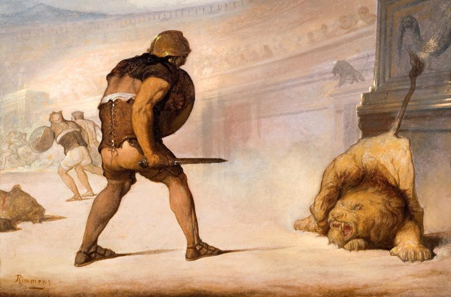 K ohromení diváků hledali pořadatelé stále exotičtější zvířata. (ilustrace: Wikimedia Commons, William Rimmer, PDM 1.0)