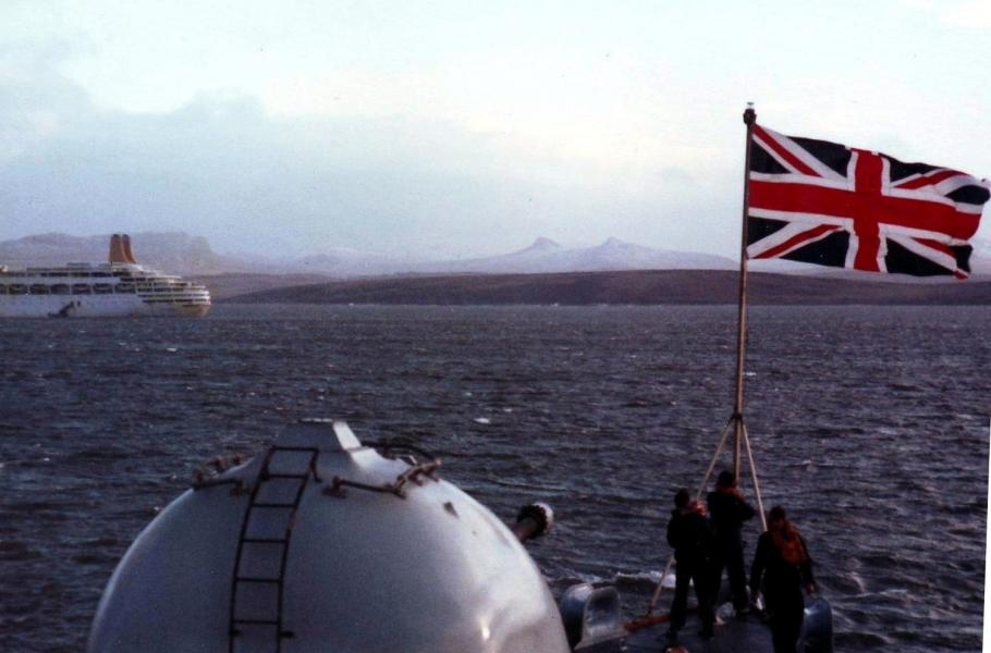 HMS Cardiff na kotvě před přístavem Port Stanley po ukončení nepřátelství. (foto: Wikimedia Commons, Ken Griffiths, CC BY-SA 3.0)
