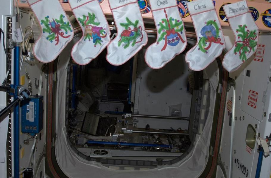 Sovětská propaganda vánočním svátkům moc nepřála, a tak se na stanicích Saljut či Mir formálně neslavily. Dnes je ovšem na Mezinárodní kosmické stanici situace jiná: k dispozici je jak umělý vánoční stromeček, tak tradiční ponožky (nesmíme zapomínat, že každá země slaví vánoční svátky jinak). Nechybí pohlednice od rodiny (dopravované zásobovacími loděmi), drobné dárečky nebo tradiční jídla (krocan s bramborovou kaší a brusinkovou omáčkou). A také speciální příděl „vánočních pochutin“ – oříšků, čokolády apod.