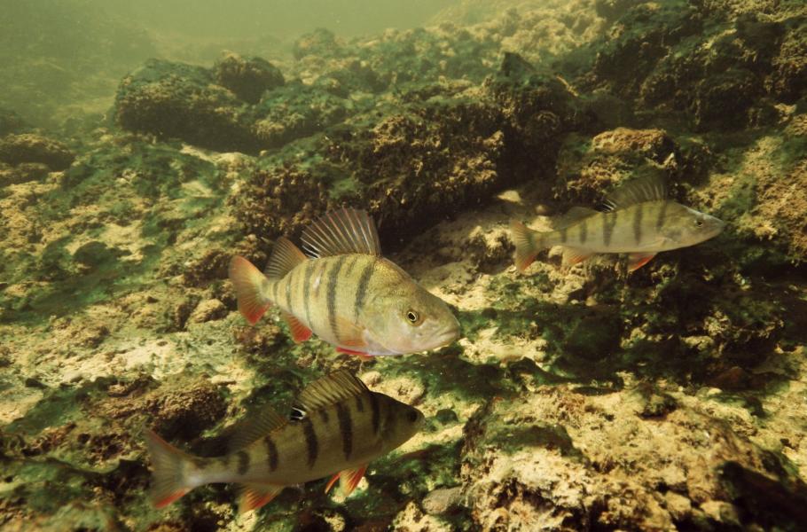 Moji fotografickou vášeň nakonec ukonejší trojice velkých okounů. Hledají na dně potravu a já, „bublající obryně“, je vůbec nezajímám. Kamarádka se vznáší opodál a kroutí hlavou nad tím, jak blízko mě okouni pustí.