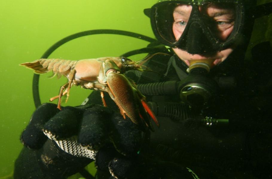 Dobře vím, že tihle velcí korýši bývají sebevědomí a nebojácní, a proto opatrně zjišťuji, zda by se nechtěl „kamarádit“. Nabízím mu ruku. Zdá se být naprosto neagresivní a klidný a já očima přemlouvám i svoji potápěčskou kolegyni, aby si raka pochovala. Po chvilce možnost procházky po jejích rukou přijímá i rak. Je to pro nás obě zajímavý zážitek a neubráníme se smíchu. Smát se pod vodou ale není jen tak, takže se nám dostává voda do masky a musíme ji „vylévat“, což je poměrně jednoduchý trik.