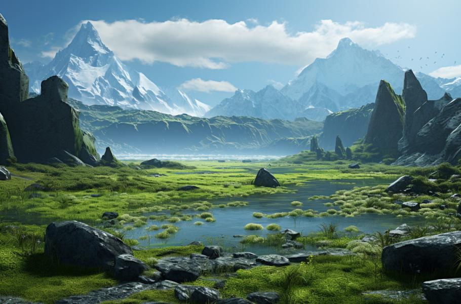 Během paleocénu a eocénu (před přibližně 66 až 34 miliony lety), měla Antarktida teplejší podnebí podobné tomu, které dnes panuje v mírném pásu. V té době byla pokrytá hustými lesy a rostlinstvem a měla teploty, které umožňovaly život rostlin a živočichů. (ilustrace: Midjourney AI, PDM 1.0)
