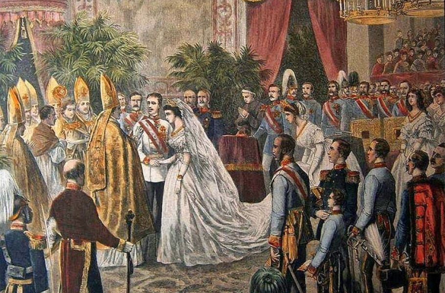 Psal se 24. duben 1854. Přesně v devatenáct hodin začal v kostele sv. Augustina velkolepý obřad. Tradiční místo habsburských svateb osvětlovalo 15 000 svíček a bylo potažené červeným sametem. Velkolepému okamžiku byli přítomni všichni, kdo něco znamenali. Oddávajícímu kardinálu Rauscherovi asistovalo na sedmdesát církevních hodnostářů. Jeho projev byl květnatý a nekonečný! Ne nadarmo se mu říkalo kardinál tlachal. Láska císařovny podle jeho slov měla „pro císaře v moři panovnických starostí znamenat ostrůvek, který je pevným a pokojně se zelenajícím přístavem v bouřích a na kterém rozkvétají usměvavé růže a půvabné fialky.“ Vyčerpaná Sissi vše vnímala skrze závoj slz.