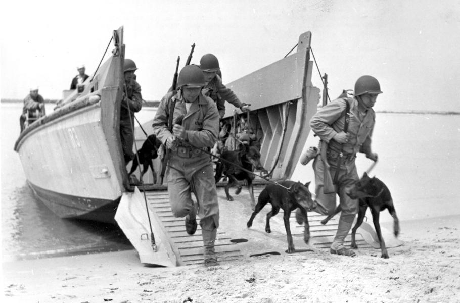 Mariňáci trénují vylodění z moře v Camp Lejeune v Severní Karolíně. Sbor námořní pěchoty upřednostňoval z velkých ras dobrmany, přesto tvořili 40 % jejich psů němečtí ovčáci. (foto: U.S. Marine Corps, PDM 1.0)