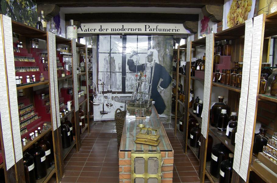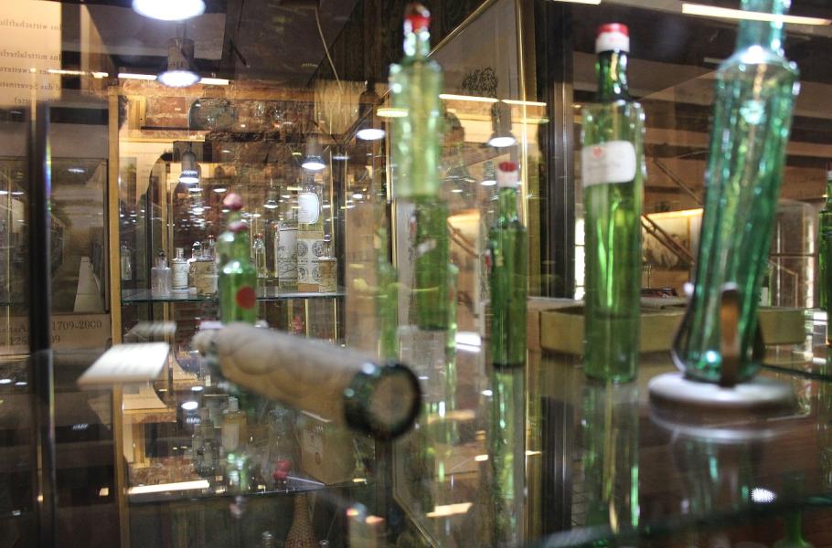 V muzeu vůní v Kolíně nad Rýnem jsou k vidění flakony staré téměř 200 let. Ve výřezu voňavkář Johann Maria Farina.