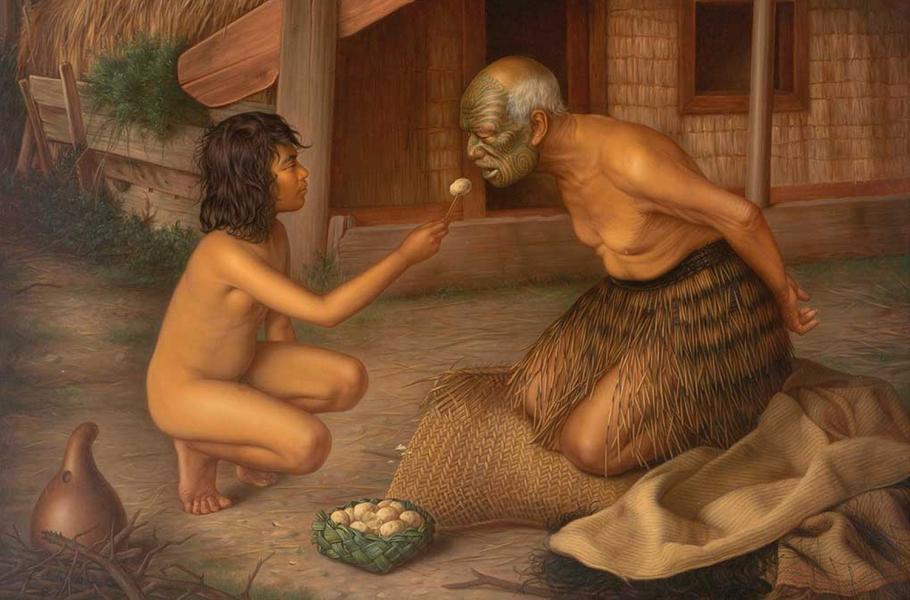 Maorská společnost měla svá posvátná tabu – jedno z nich se týkalo mrtvých lidských těl a kostí. Ti, kteří s nimi přišli do styku, se prý nesměli dotýkat jídla a museli být krmeni. (ilustrace: Wikimedia Commons, Gottfried Lindauer, PDM 1.0)