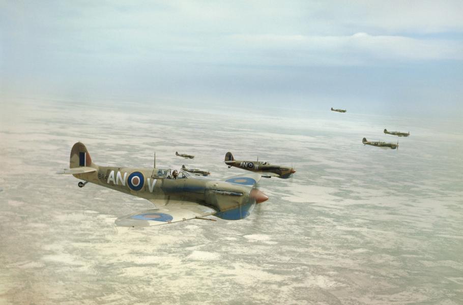 Formace stíhaček Supermarine Spitfire Mk.VB (Trop) od 417. perutě RCAF nad Tuniskem v roce 1943. (foto: Wikimedia Commons, Imperial War Museums, IWM Non Commercial Licence)