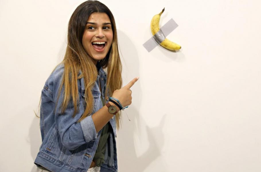 Je to žluté, je to přilepené páskou ke zdi, stojí to 120 000 dolarů a dá se to sníst. Co je to? Banán prodaný za uvedenou cenu jedním umělcem, který jiný umělec s potěšením pozřel, aby šokoval měšťáky!