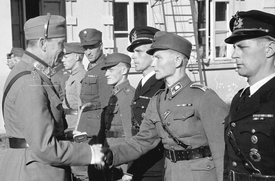 Polní maršál Mannerheim předává Mannerheimův kříž jednomu z kadetů, září 1942. (foto: Wikimedia Commons, Gummerus, PDM 1.0)