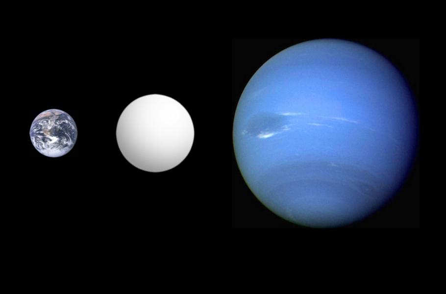 Srovnání velikosti Země, superzemě CoRoT-7 b a Neptunu. (ilustrace: Wikimedia Commons, Aldaron, CC BY-SA 3.0)