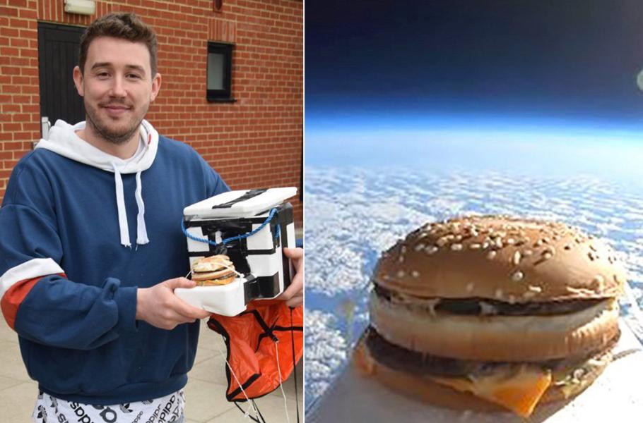 YouTuber Tom Stanniland se rozhodl natočit video, jak vyšle do vesmíru hamburger, a jakmile dopadne na zem, tak jej sní. Připravil tedy pro pokrm speciální polystyrenový box a připevnil k němu kameru a GPS lokátor. Krabičku posléze uchytil k meteorologickému balonu, který ji vynesl zhruba do výšky 38 kilometrů, načež praskl.