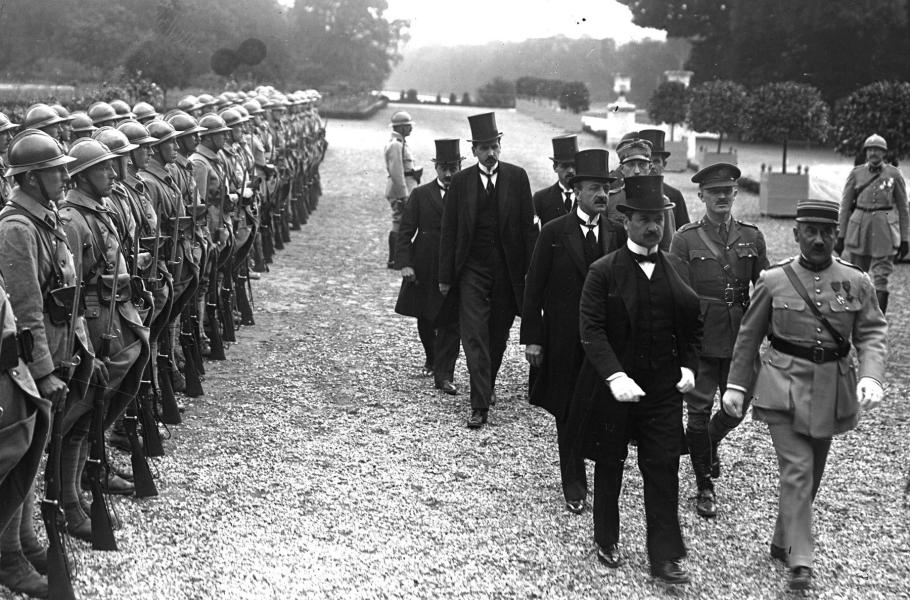 Slavnostní podpis Trianonské smlouvy: Ágost Benárd, vedoucí maďarské delegace, procházející před čestnou stráží ve Versailles. (foto: Wikimedia Commons, Gallica Digital Library, PDM 1.0)