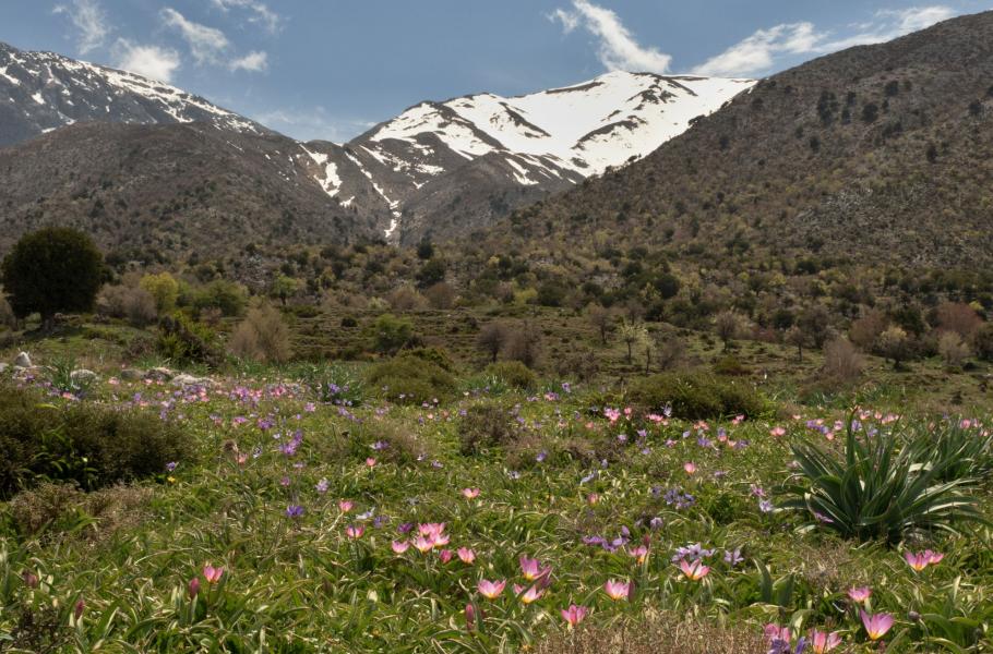 Pohled z planiny Omalos na vrcholky Bílých hor (Lefka Ori) s divokými růžovými tulipány (Tulipa bakeri) a fialovými sasankami věncovými (Anemone coronaria) v popředí. (foto: Cedrik a Štěpánka Haškovcovi - se souhlasem k publikování)