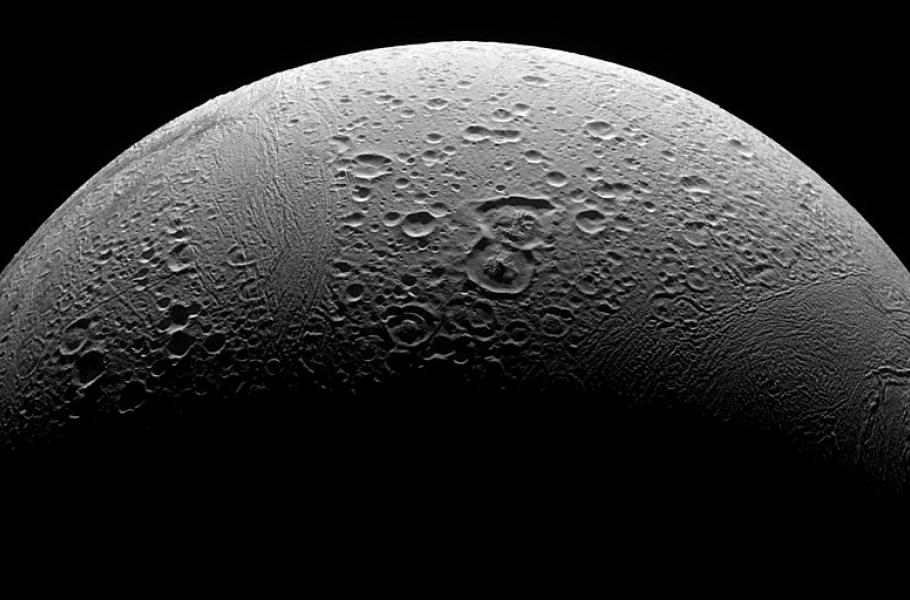 Mezi podivuhodné mrazivé světy, které obíhají kolem Saturnu a jeho prstenců, patří i ledový Enceladus. Jde o šestý největší měsíc Saturnu, v průměru měří téměř 500 kilometrů a je tak zbruba sedmkrát menší než náš Měsíc. Na rozdíl od něj je ale Enceladus z větší části pokrytý ledem, který tak dobře odráží sluneční záření, že na jeho povrchu panuje extrémně nízká teplota –198 °C. Pro srovnání – na našem souputníkovi padá průměrná teplota k –106 °C na denní straně a na té noční až k –183 °C.