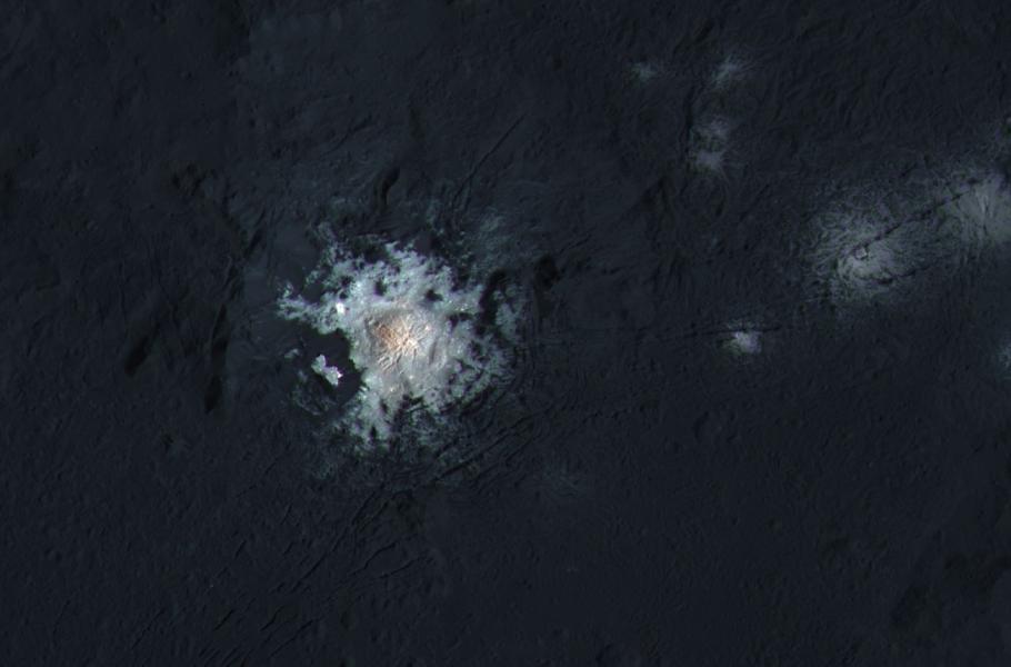 Světlé skvrny na povrchu planetky Ceres představují záhadu, která vědce trápí již řadu měsíců. Nejnovější data shromážděná sondou Dawn ukazují, že tento výrazně světlý materiál uvnitř kráteru Occator je tvořen směsí solí. Navíc se zdá, že centrální část je z geologického hlediska velmi mladá – podle odborníků zhruba 4 miliony let. Samotný kráter je přitom o 30 milionů let starší. Je tedy pravděpodobné, že jde o pozůstatek relativně nedávné vesmírné kolize. Tato srážka podle všeho vytvořila prasklinu v (již tak značně rozpraskaném) povrchu Ceres, kterou následně začala na povrch stoupat solanka.