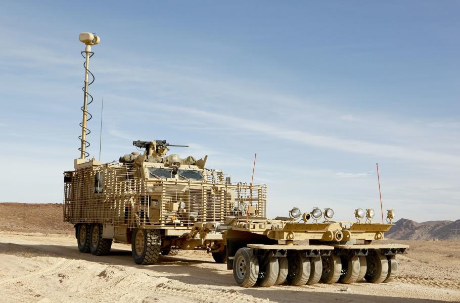 Lehčí typy mechanických odminovačů se někdy používají i ve spojení s kolovými obrněnci – zde britský Mastiff. (foto: Wikimedia Commons, Steve Dock, OGL v1.0)