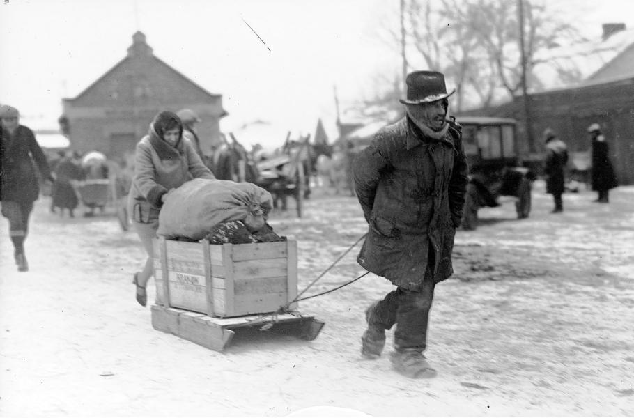 Únor 1929 v Krakově. Muž táhnoucí sáně s uhlím během zimy tisíciletí. (foto: Wikimedia Commons, PDM 1.0)