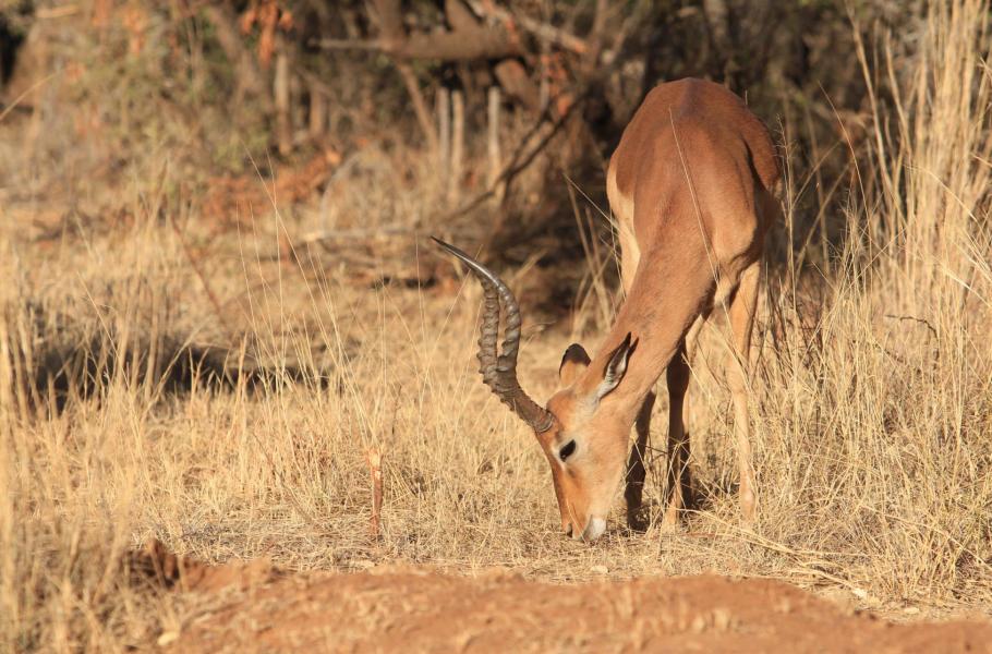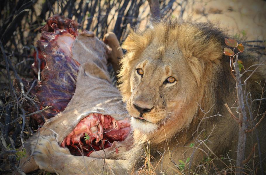 Nedaleko od Shumba Pan na nás čekal největší zážitek, který si pro nás Hwange uchystalo. Kousek od pijícího stáda slonů se za křovím pohyboval stín. Na první pohled se zdálo, že jde o antilopu nebo prase bradavičnaté, ale pak jsme si uvědomili, že charakter pohybu ukazuje spíše na šelmu. Zvolna jsme objeli napajedlo a po malé prašné cestě jsme se ke křovisku blížili z opačné strany. Naše víra a trpělivost byly odměněny. Před námi ležel na zemi statný lví samec a hodoval na čerstvě ulovené antilopě kudu.