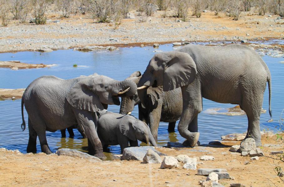 Sloni zcela tiše a spořádaně přišli k vodě a rozehráli neuvěřitelné představení povah a příběhů. Slůňata, podle vzrůstu tak tříletá, se pošťuchovala, „kradla“ si vzájemně choboty a přetlačovala se o bahnitý bazének, který přirozeně vznikl s úbytkem vody. Zbylá voda lákala i dospělé samice, a tak o bahenní lázeň vznikla solidní strkanice. Té využilo několik žiraf, které slony v uctivé vzdálenosti obešly a v uvolněné části se přiblížily k napajedlu, aby svým jedinečným způsobem s doširoka rozkročenýma nohama hasily žízeň. Celou scenérii dokreslovalo mnoho ptáků nabírajících si v rychlosti kapky vody do zobáků a okamžitě odlétajících pryč. Den se nachýlil ke svému konci a blížil se čas, kdy je nutné být v kempu nebo park úplně opustit.