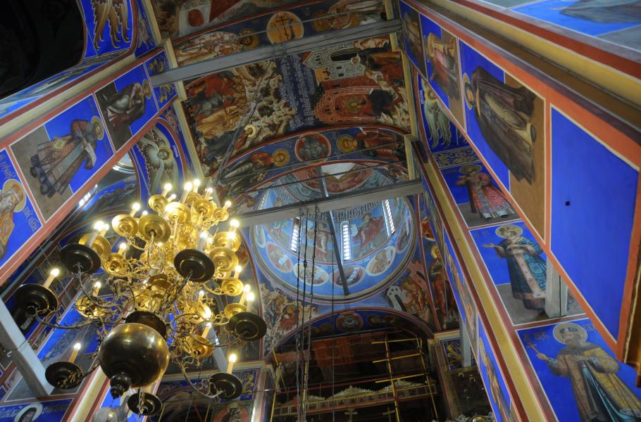 V chrámu sv. Jana Evangelisty hlídá „bábuška“ s šátkem přes vlasy a ochotně vám ukáže nejkrásnější fresky zdobící tamní stěny. Jejich barvy zůstávají stále živé a pronikavé, což téměř popírá skutečnost, že malby vznikly téměř před čtyřmi staletími: Znázorňují létající anděly, tiše stojící světce i Krista trpícího na kříži.
