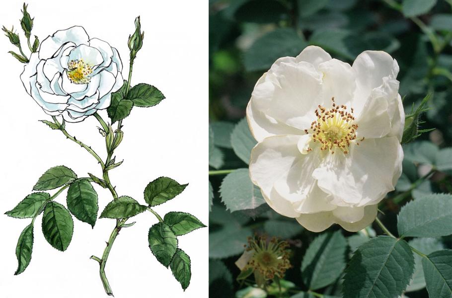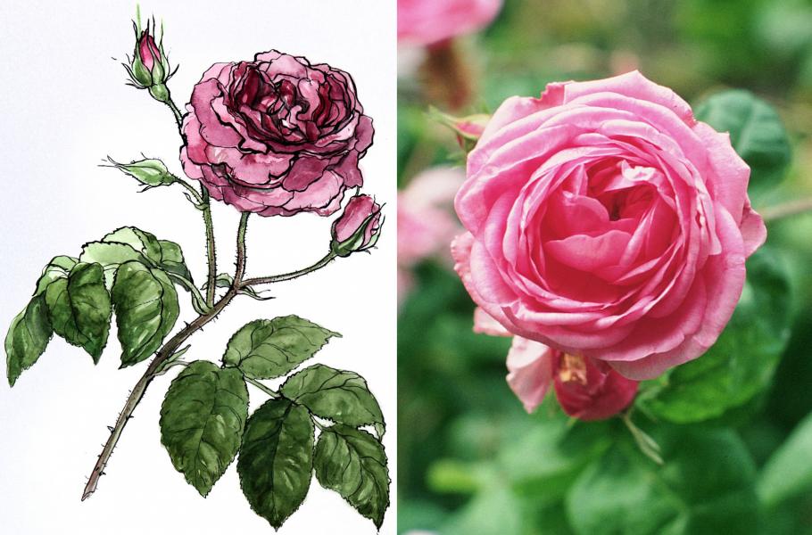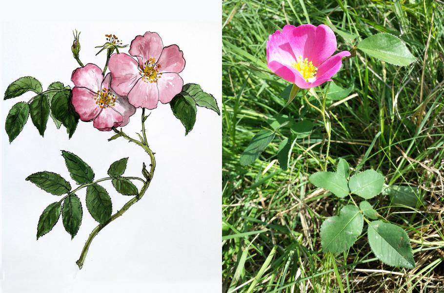 Růže galská (Rosa gallica) nebo též růže keltská má od raného středověku doložené hospodářské využití. Pěstovala se v klášterních a později lékárnických zahradách jako Rosa officinalis; využíván byl květ i šípek. (foto: Wikimedia Commons, Stefan.lefnaer, CC BY-SA 4.0 + ilustrace Tereza Samková)