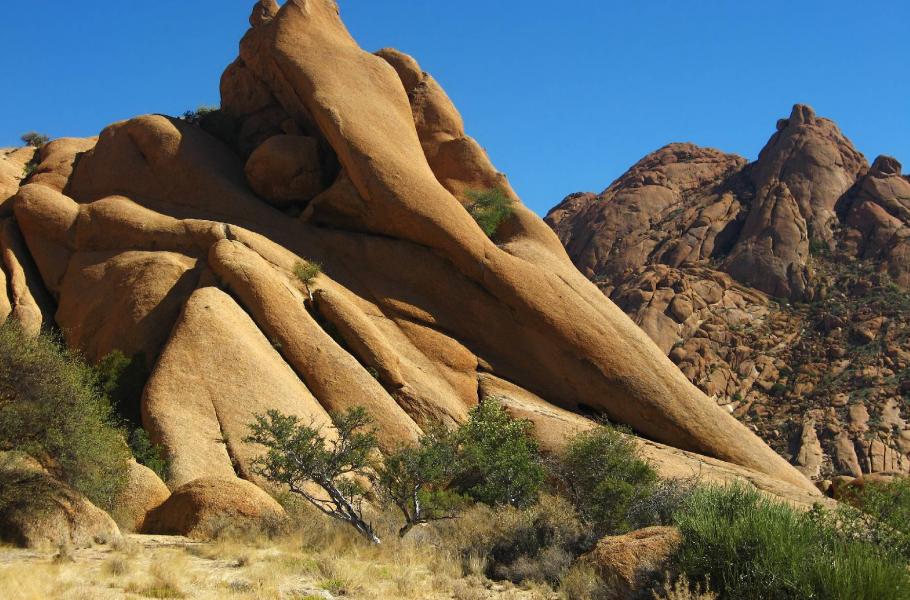 Kraj Damaraland je obrovským prostorem divoké přírody, kde lze mimo oficiální parky spatřit slony, žirafy, zebry a snad i nosorožce. Najít tyto tvory je nelehký úkol, ale naše skupinka, nabažená podobných setkání z parku Etosha, sem dorazila s jiným záměrem. Směřujeme do „žulového srdce Namibie“ – pohoří Pontok, kde leží hned několik naprosto unikátních skalních oblastí. Odbočka z hlavní silnice má povrch horší rolety, která spolehlivě mění nové auto v solidní ojetinu. Vzdálenost od křižovatky k cíli ale není nijak drastická, a tak zanedlouho stojíme u brány přírodního parku.