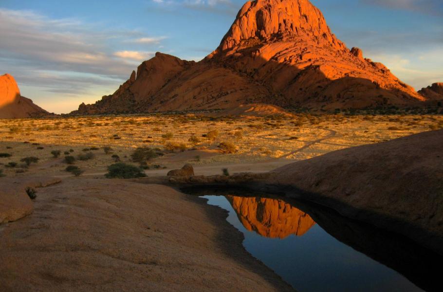 Na samotné Spitzkoppe samozřejmě nemáme, ale mohutný skalní blok ležící jižně od něj má své slabiny. Objevujeme poměrně snadný výstup na vršek, odkud se otevírá nádherný kruhový výhled. A protože nejkouzelnější jsou zde především večery s kýčovitými západy slunce, je jasné, že se sem ještě dnes vrátíme. Průzkum nám však mimo příslibu večerního extra zážitku přinesl ještě jedno překvapení. Při sestupu totiž nalézáme velmi dobře skryté jezírko ve skalách. Objev je to skutečně zajímavý, neboť voda v této velmi suché oblasti je velmi vzácná. Nejde sice o spolehlivý zdroj pitné vody, ale pro nás má jinou hodnotu. Perfektní poloha mělké vany, v níž se jako v zrcadle odráží působivý hrot „afrického Matterhornu“ je přivítána s velkým nadšením. A tak bez dalšího hledání stavíme tábor v blízkosti tohoto nenadálého nálezu.