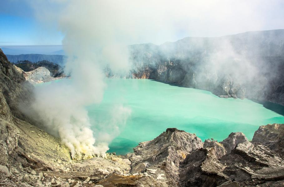 Indonéský vulkán Ijen nabízí úchvatnou podívanou na tyrkysové jezero a za tmy také na tajemné modré plameny. Místo je však mimo jiné velmi bohaté na síru a několik desítek horníků tam denně pracuje v nesmírně tvrdých podmínkách