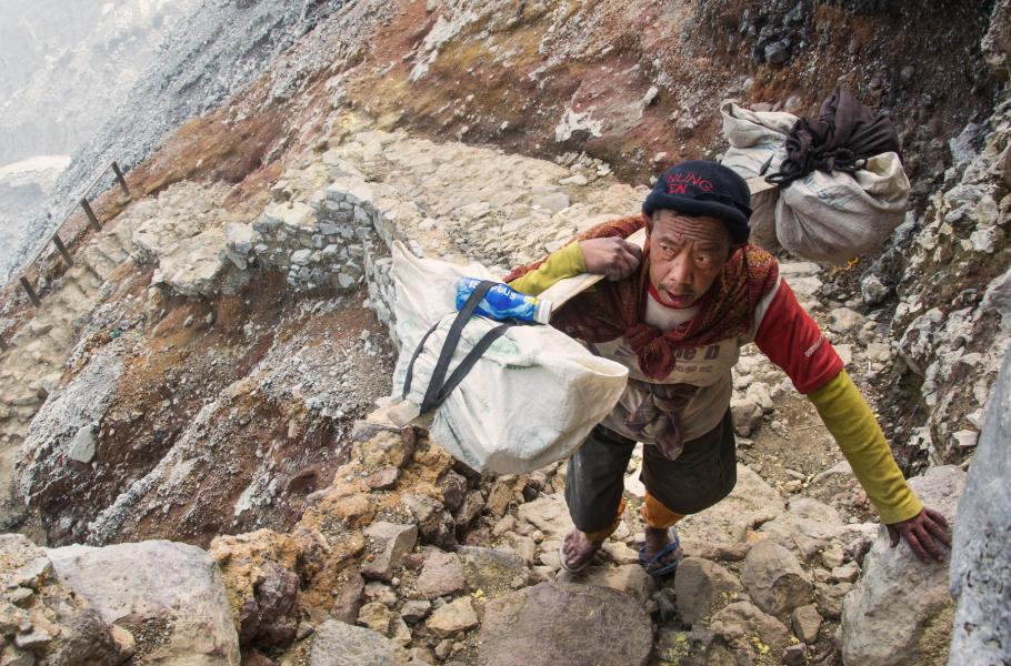 Dole v kráteru ovšem také vyvěrá síra, pro kterou se trmácejí místní horníci. „Turistům vstup zakázán“, informuje nás rezavá cedule na okraji srázu. Většina návštěvníků se v tomto místě zastavuje. Muži s prázdnými koši však pokračují dál, stezkou dolů. Vydávám se za nimi. Strmá cesta vytesaná do kamene směřuje na dno kráteru – k místu, kde vyvěrá roztavená síra. Ztuhlý materiál pak horníci lámou pomocí kovových tyčí a v dřevěných koších ho vynášejí ven. Veškerá práce probíhá ručně a náklad na zádech obvykle váží 70–90 kg.