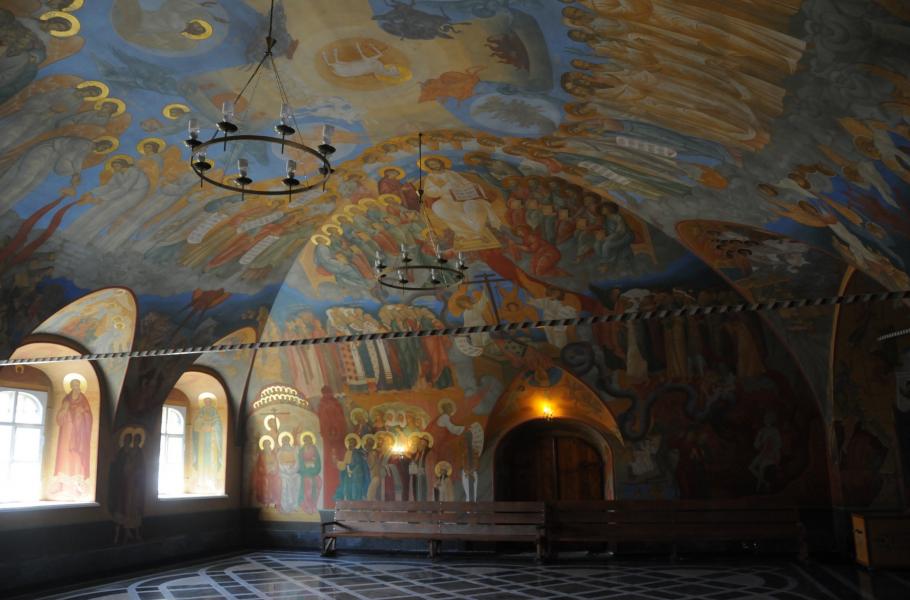 Uvnitř se nacházejí dvě místnosti vyzdobené freskami desítek světců, které se koupou v přítmí projasňovaném plameny svíček. V dobách nejtužšího komunismu byl přitom svatostánek zavřený nebo sloužil jako pekárna. Vzpomínky na temnou éru dnes vyvolává vůně čerstvého pečiva, jež se line z nedalekého pekařství.
