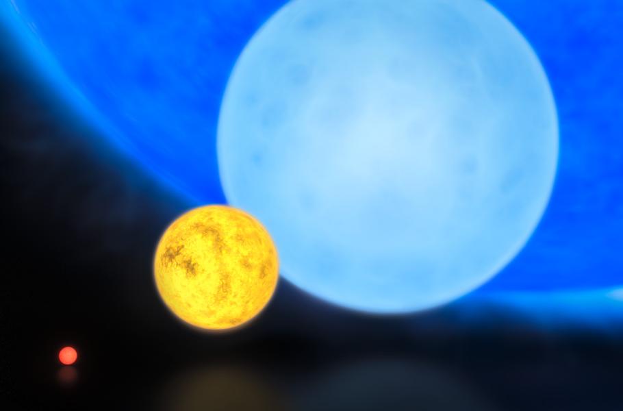 Za jednu z nejtěžších hvězd se považuje R136a1, dosahující hmotnosti zhruba tří set sluncí. Vizualizace znázorňuje velikosti červeného, žlutého a modrého trpaslíka ve srovnání s vysoce zářivou Wolf–Rayetovou hvězdou R136a1. (ilustrace: ESO/M. Kornmesser, CC BY-SA 4.0)