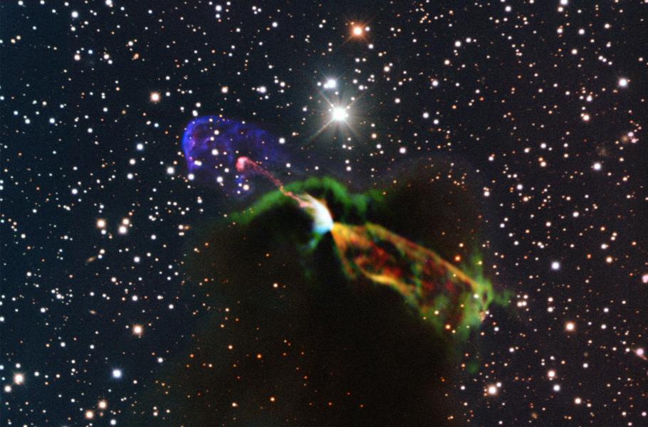Tento mimořádný záběr objektu Herbig-Haro (HH 46/47) vznikl kombinací pozorování získaných v rádiové oblasti pomocí teleskopu ALMA a dalekohledu NTT ve viditelné oblasti spektra. Záběry mladé hvězdy získané pomocí ALMA (oranžové a zelené odstíny vpravo dole) odhalují mohutný jet hmoty pohybující se směrem od nás, která je na snímcích ve viditelné oblasti skryta za oblaky prachu a plynu. V levé části (v růžových a fialových odstínech) je zachycena část jetu mířícího směrem k nám, pozorovatelná ve viditelné oblasti spektra.