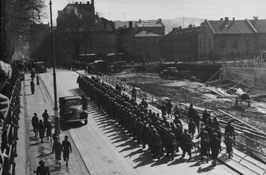 Jednotka Wehrmachtu na pochodu ulicemi okupovaného Osla, 1941. (foto: Wikimedia Commons, National Library of Norway, Henriksen & Steen, CC BY-SA 4.0)