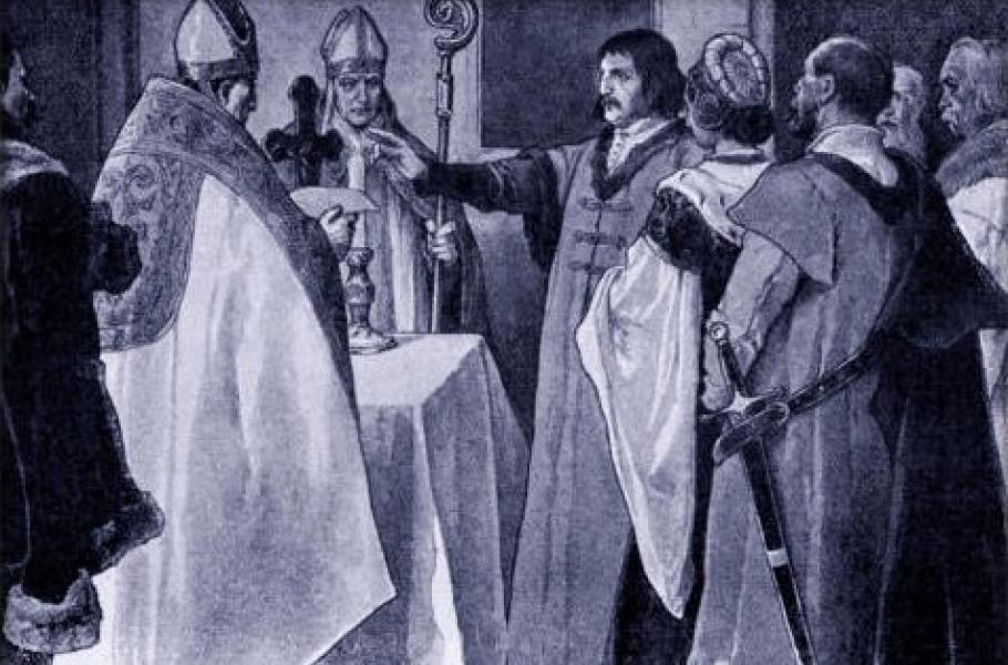 Přísaha Jiříka z Poděbrad a jeho choti před korunovací. (ilustrace: Wikimedia Commons, ΑΩ institut, CC0)